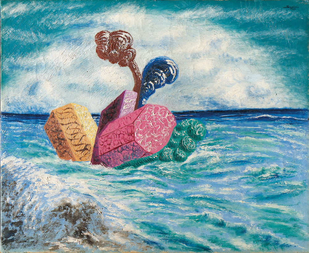 The key themes of Savinio’s painting focus on the world of memory and childhood, which are also present within his writing. One of the cornerstones of his work is nostalgia for his father Evaristo, presented within his work as a childhood ‘descent into the past’ through images of toys, placed like islands in the sea or dark forests, that allude directly to his grief-stricken childhood. The toys depicted in the paintings rise like mausoleums and trophies to celebrate the lost season that the artist revisits and rediscovers through painting. In the following years, Savinio built a large iconographic apparatus of hybrid and metamorphic figures, suspended between ancient statuary and the depiction of living bodies, between artifice and humanity, monstrosity and beauty. These colourful shapes and silhouettes create oneiric landscapes and ‘islands’ where the artist’s memories merge with myth.