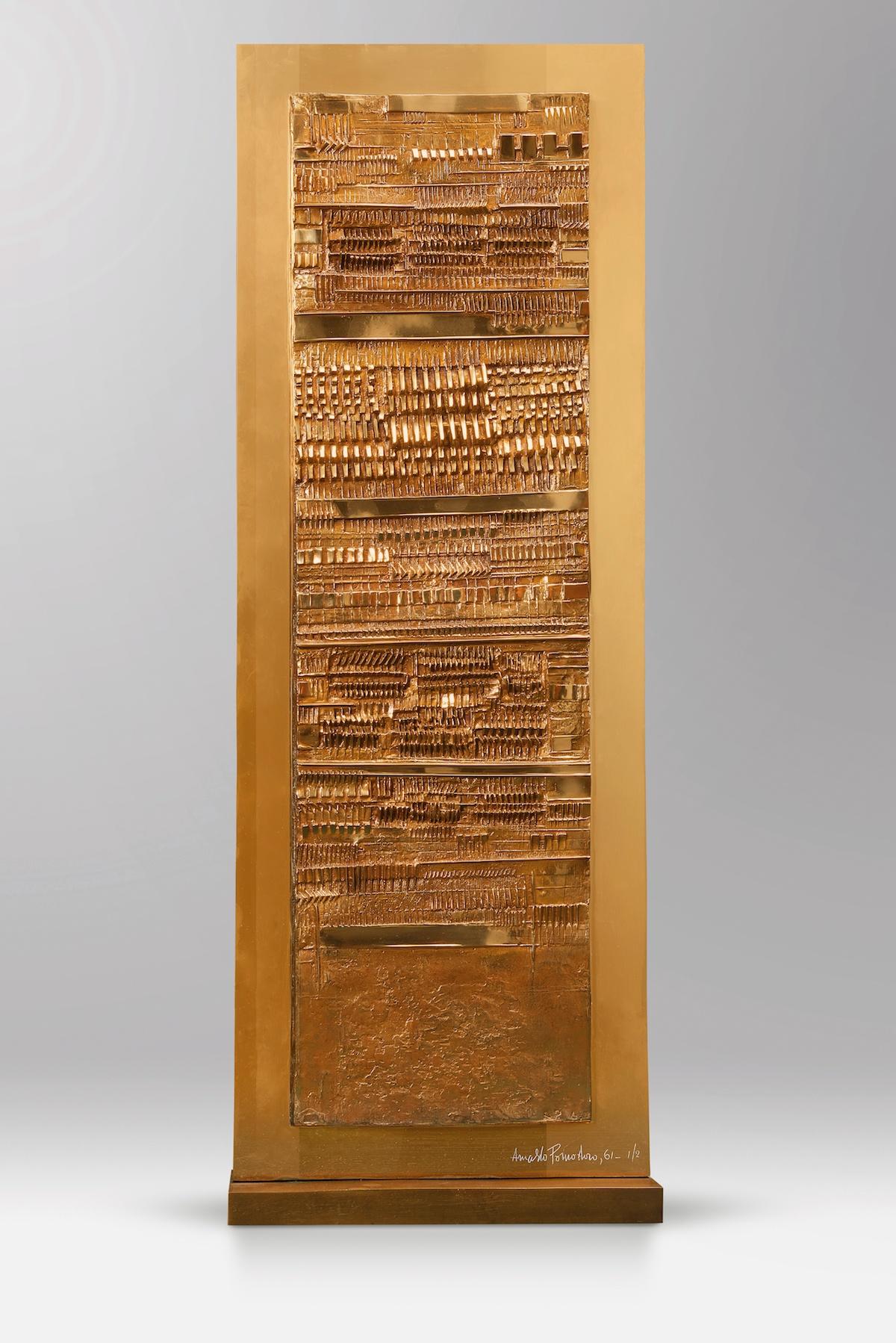 His sculptures are found in the most important public collections and sited in urban spaces all over the world. Pomodoro’s environmental works include: Earth and Solar Motion, the long concrete mural for the Minoa Symposium near Marsala, the Armoury in the Poldi Pezzoli Museum in Milan, Entering the Labyrinth, dedicated to the Epic of Gilgamesh and the Carapace cellar in Bevagna for the Lunelli family, unveiled in June 2012.