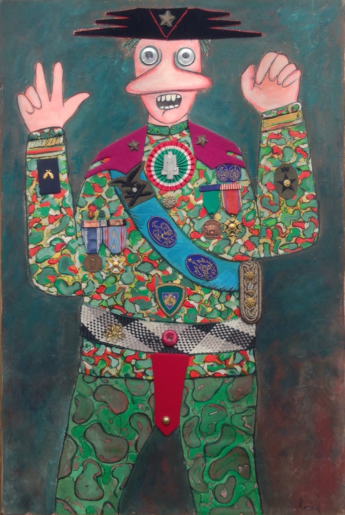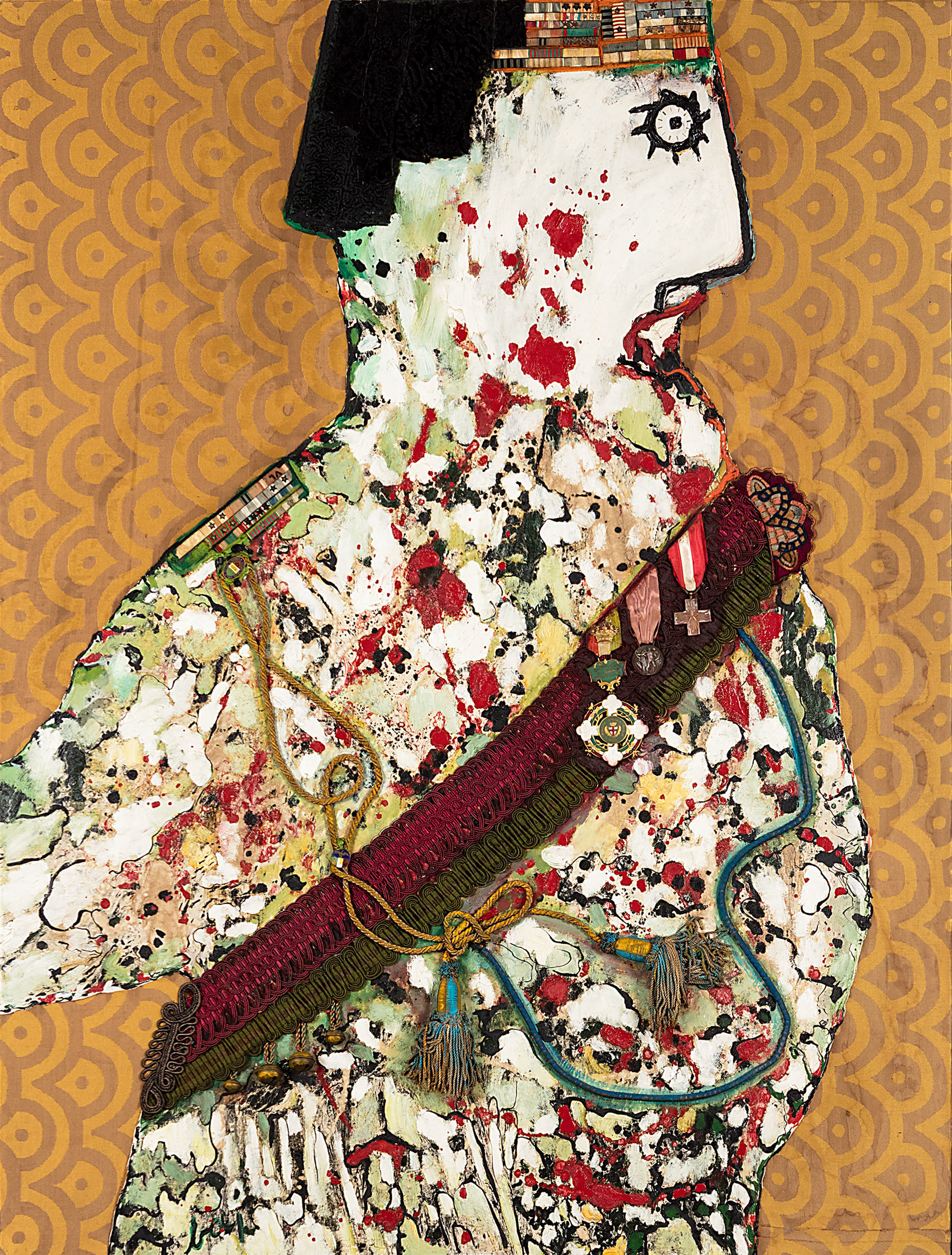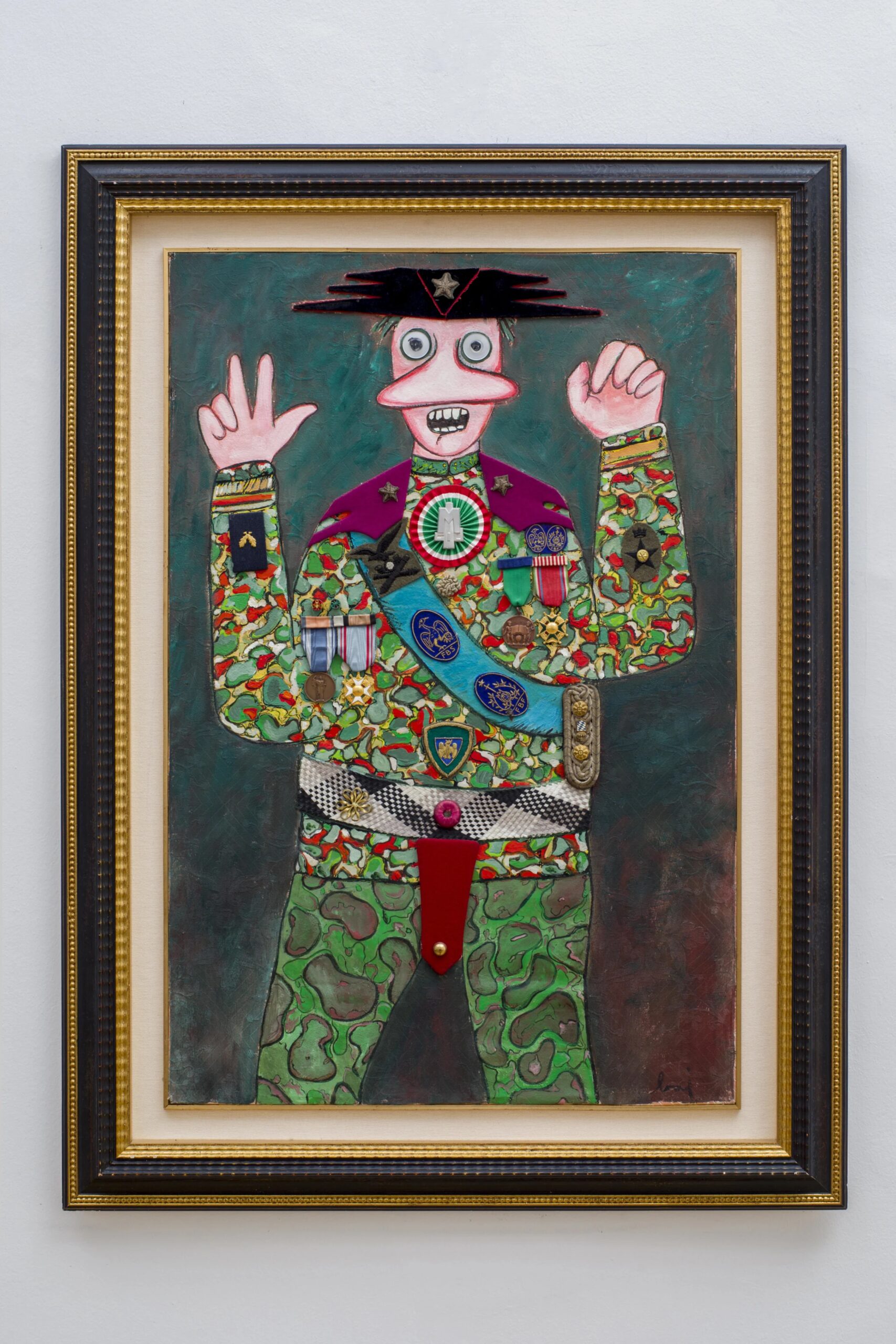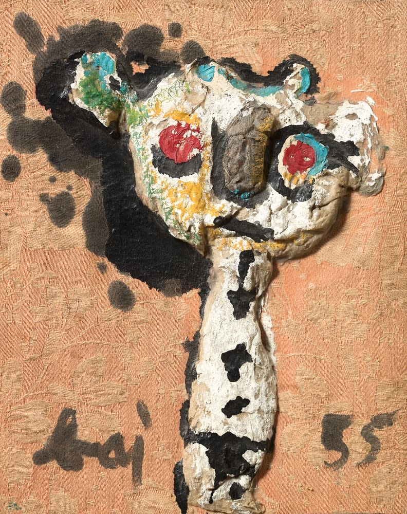 Enrico Baj was born in Milan in 1924 and became one of Italy’s best-known artists. Baj was also a prolific essayist and polemicist, with his artistic practice navigating the 1950s and 60s, alongside the likes of Fontana, Manzoni and Klein, forging relations with the Cobra group, Duchamp, as well as the exponents of Nouveau Réalisme and Pataphysics. A great believer in both the Surrealist and Dada movements, Baj often experimented with new techniques and stylistic solutions, making collages and mixed-media assemblages using the most diverse materials, including textiles, metals, mirrors, and coloured glass.