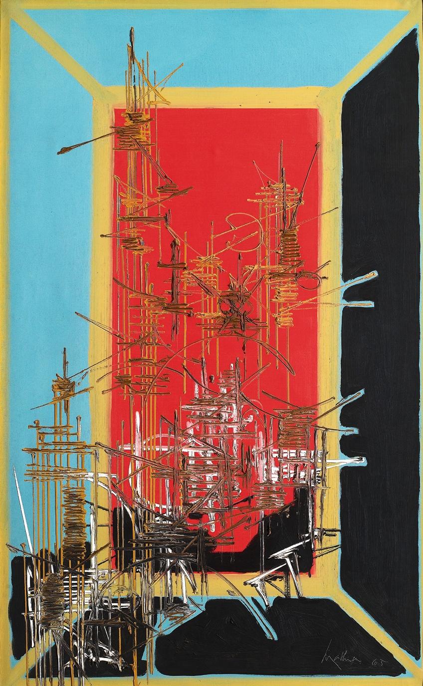 Soon Mathieu began working with abstraction, citing Edward Crankshaw’s Joseph Conrad: Some Aspects of the Art of the Novel (1936) as a source for his investigation. His early abstract work consists of amorphous shapes and experimentation with drip techniques. In 1947 Mathieu moved to Paris, where he worked as the head of public relations in the American transatlantic shipping company United States Lines. While in Paris, he quickly became attracted to the work of artists such as Camille Bryen and Wols (Alfred Otto Wolfgang Schulze), which he referred to as “Abstraction lyrique.” Within his first year there, he organized L’imaginaire (The imaginary) at Galerie du Luxembourg to promote Lyrical Abstraction. In addition to these activities, he engaged in philosophical and theoretical issues pertinent to developments in Art Informel.