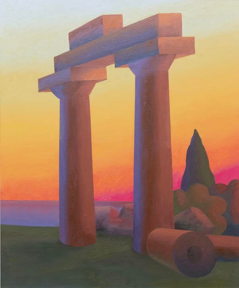 From 1976 he worked on a series of simplistic landscapes composed with bright colours, depicting architectural ruins and visions of classic columns. These works are particularly notable due to Salvo’s masterful rendering of natural light, with each piece presenting a convincing specificity of dawn, daylight, dusk, or darkness. These landscapes became his best-known works and between 1982 and 1983 he gained extensive notoriety in Europe, with retrospective exhibitions held in Gand, Lucerne and Lyons. As well as being invited to participate in high-profile exhibitions such as documenta 5 in 1972, and Venice Biennale in 1976 and 1984.