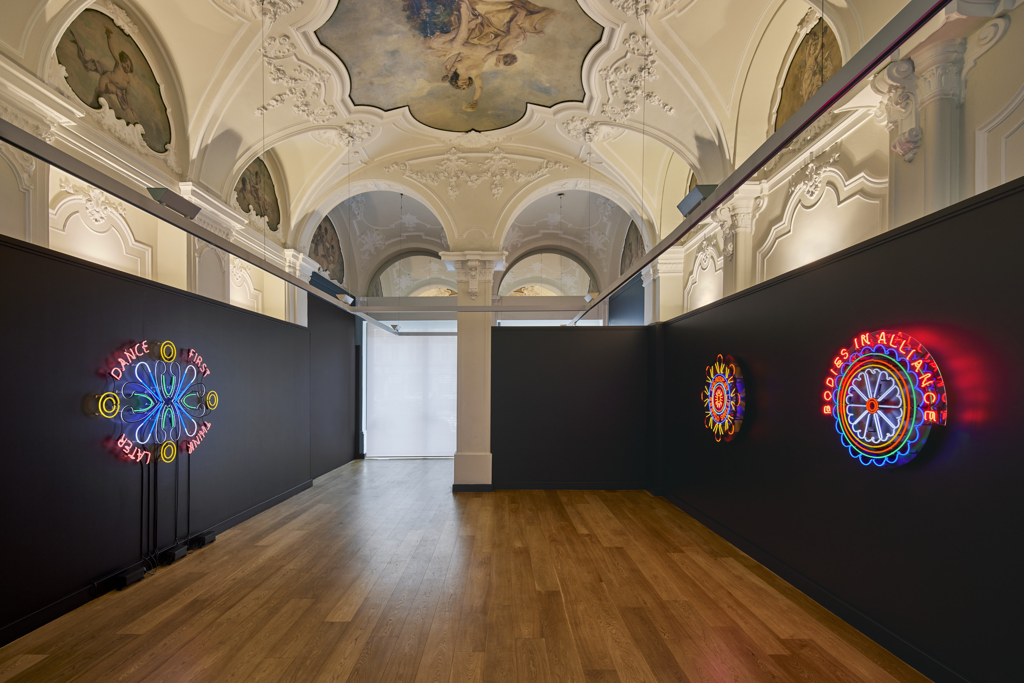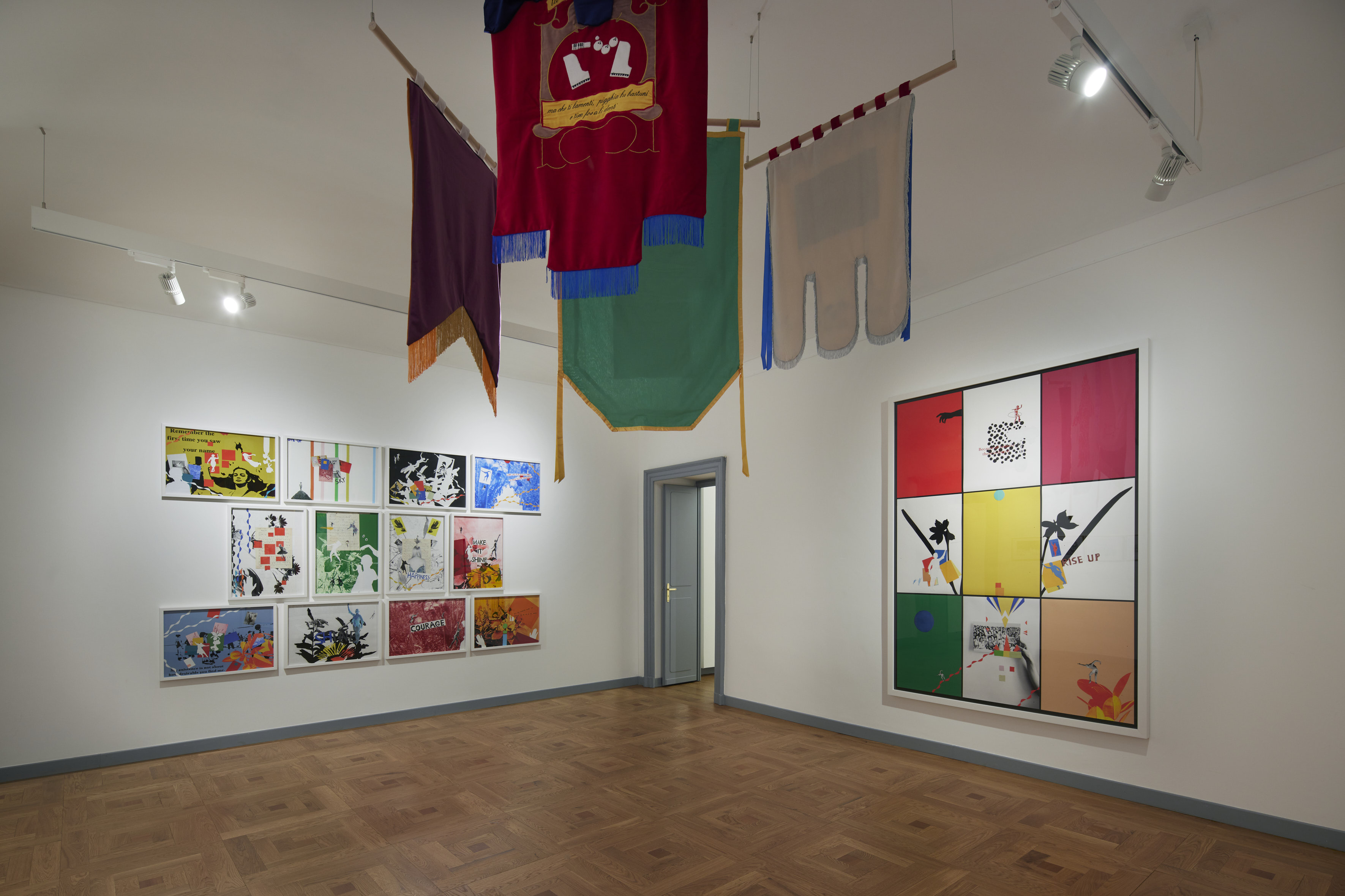 The exhibition in Turin offers a selection of works, including many previously unseen pieces. These illustrate her wide production, characterised by the plurality of techniques and languages and include light sculptures, installations, paintings, pencil drawings, collages and embroidered banners.