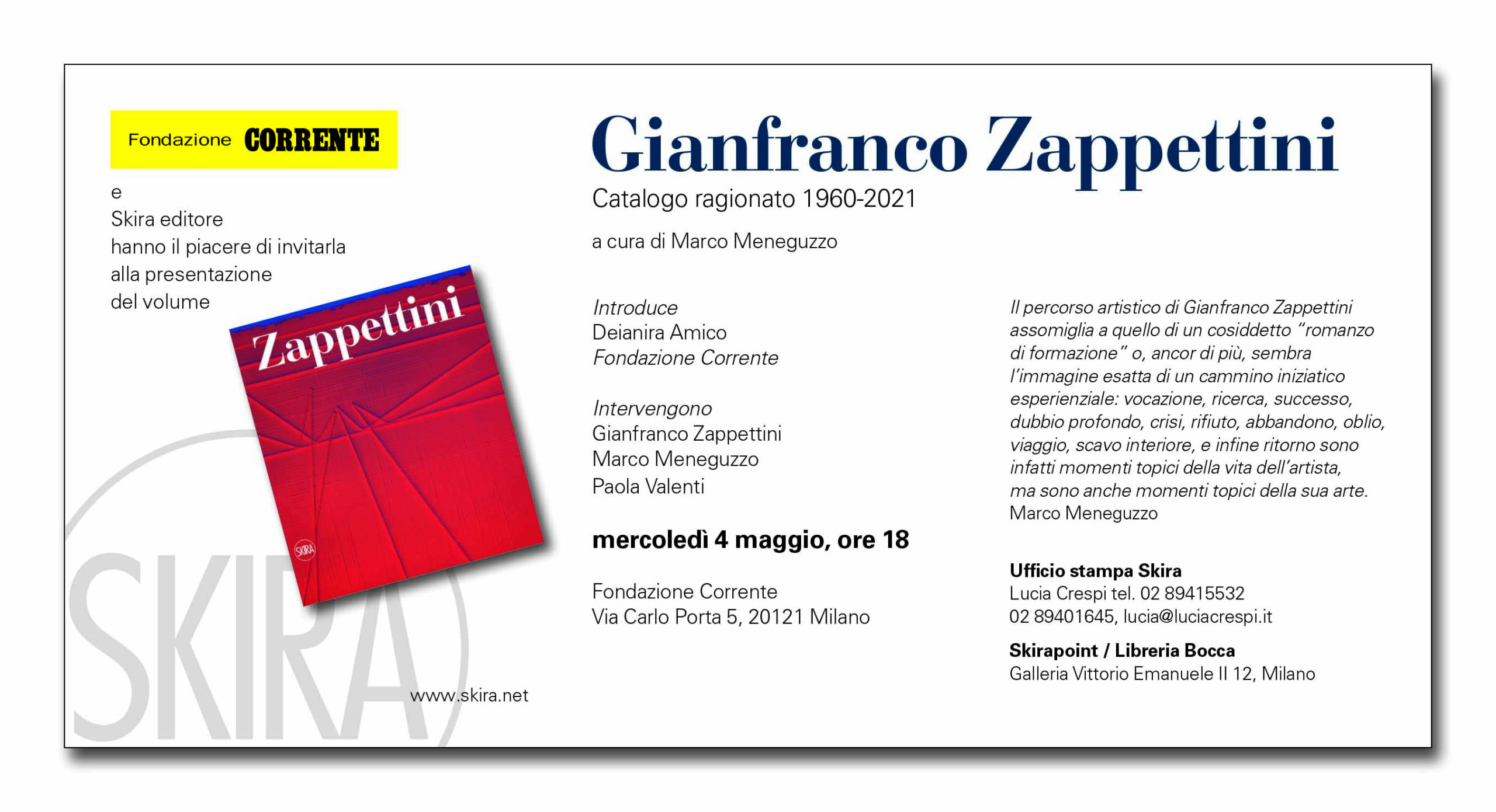 Dopo una introduzione da parte di Deianira Amico della Fondazione Corrente interverranno Gianfranco Zappettini, Marco Meneguzzo e Paola Valenti.