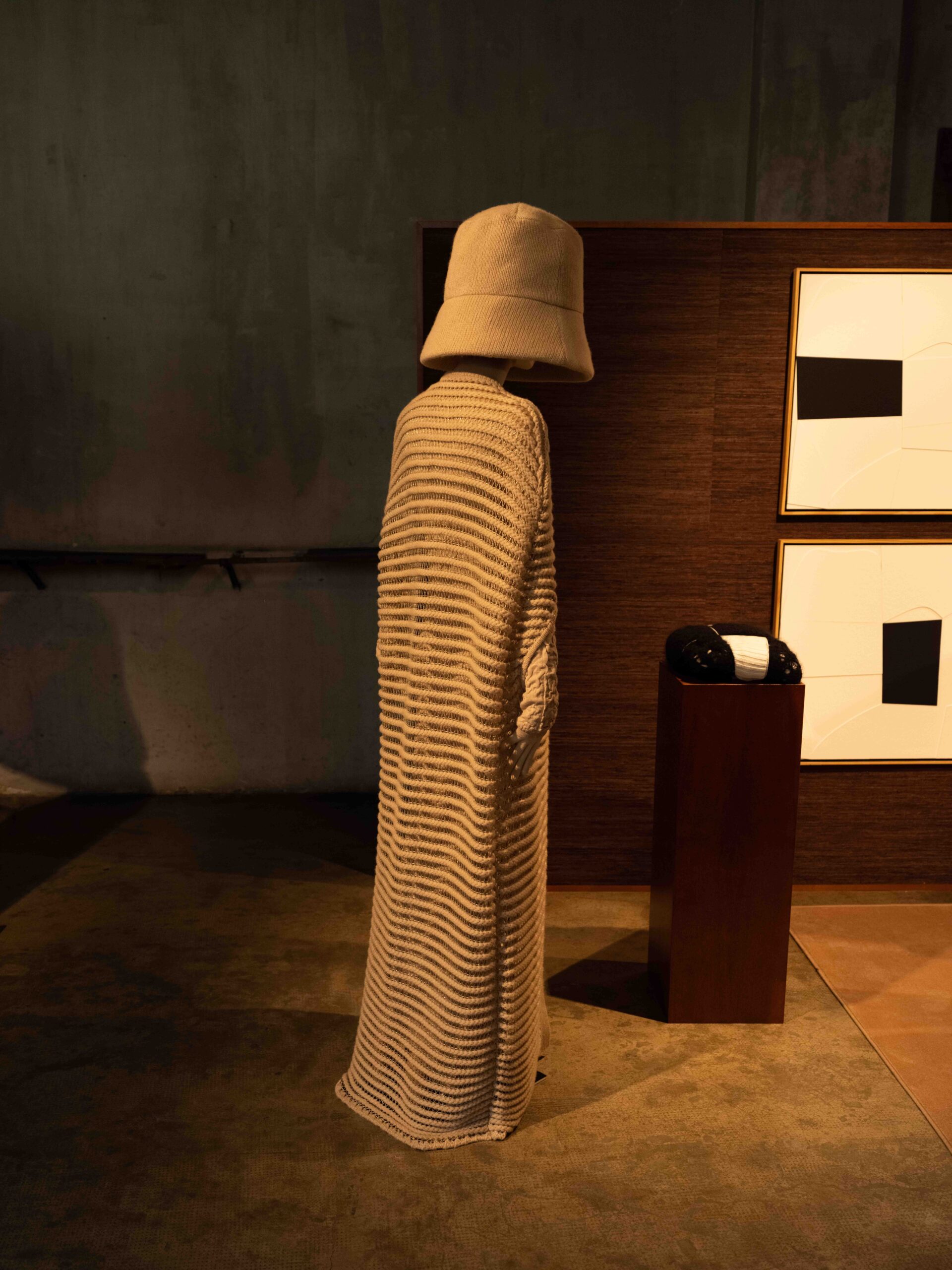 Le iute e i rammendi dell’artista ispirano una continua ricerca evolutiva della maglieria, espressione di una maestria artigianale profondamente radicata nei valori e nel DNA dell’azienda. Le texture degli abiti raggiunge la massima espressione nella spalmatura cracklé, finitura che replica il “Grande Cretto”, conferendo una nuova vita al jersey di cotone. Le giustapposizioni e gli assemblaggi tattili presenti nelle opere dell’artista umbro, si traducono in total look che spaziano tra pregiati cashmere, eleganti lane double, soffici shearling, paillettes stampate scintillanti e tweed tridimensionali.