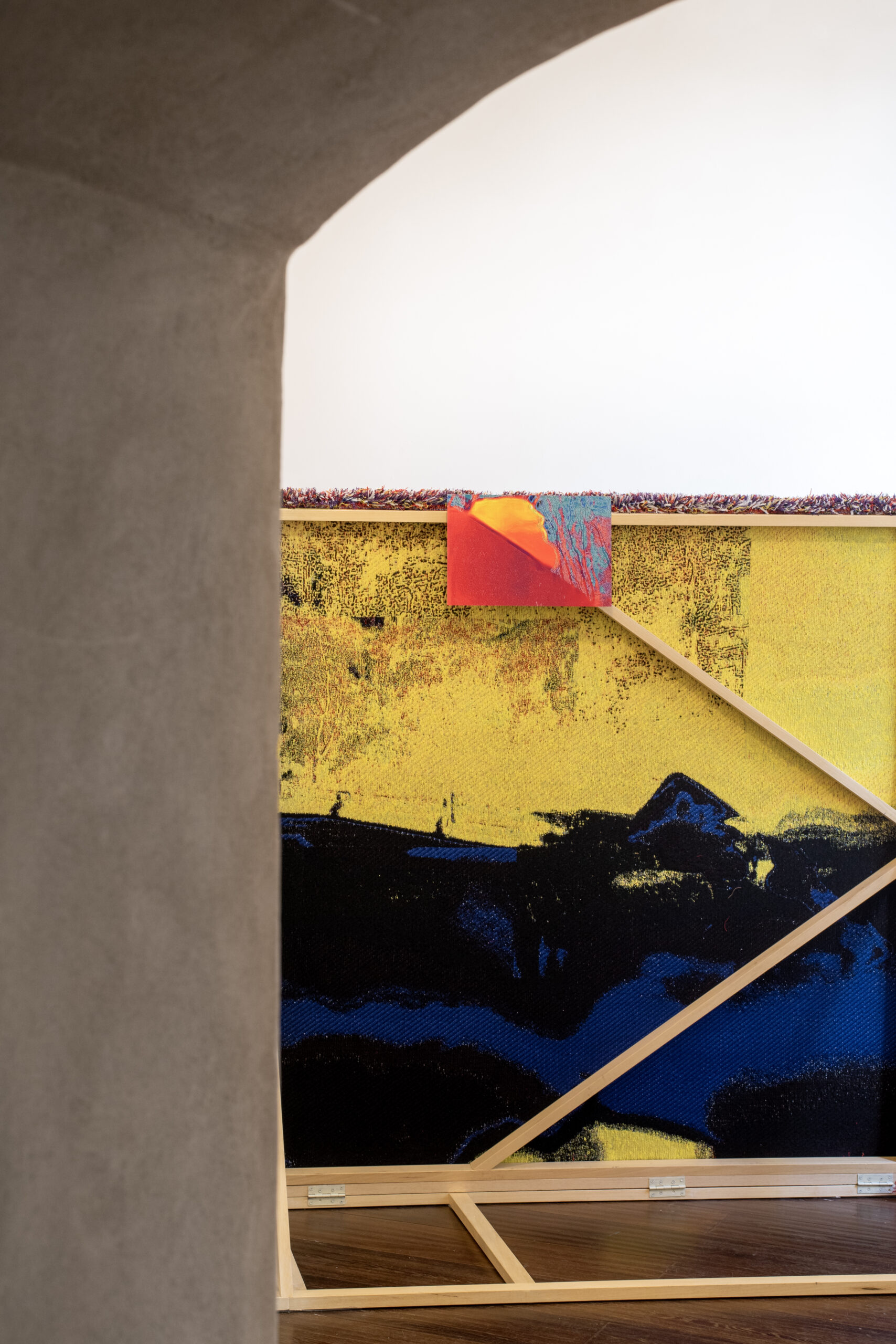 Presenza centrale nell’installazione è un arazzo di grandi dimensioni in lana e fibre di plastica riciclate realizzato in collaborazione con Giovanni Bonotto, attraverso il quale l’artista si pone in dialogo con gli affreschi quattrocenteschi del palazzo.
